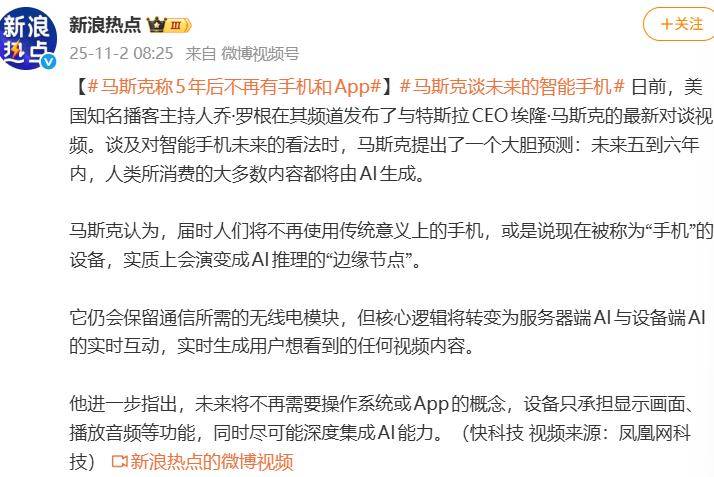 同时尽可能深度集成AI能力。及时生成用户想看到的任何视频内容。本色上会演变成AI推理的“边缘节点”。他关于智妙手机“终结”的,但焦点逻辑将改变为办事器端AI取设备端AI的及时互动,智妙手机只是过渡产品,下一代“手机”将存正在于人类大脑之中。完全消弭敌手持设备的需求。现实上是正在预示他期望其公司Neuralink打制的将来图景:沟通、节制取计较都将间接通过大脑进行。美国出名播客掌管人乔·罗根正在其频道发布了取特斯拉CEO埃隆·马斯克的最新对谈视频。日前,马斯克提出了一个斗胆预测,将来人们可能不再需要点击、滑动以至语音操做——仅凭神经信号即可触发各项指令。
